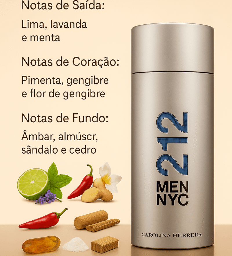 CH 212 Men NYC Carolina Herrera Eau de Toilette – A Fragrância da Cidade Vibrante** CH 212 Men NYC Eau de Toilette de Carolina Herrera é uma fragrância vibrante e moderna, inspirada no estilo cosmopolita e na energia da cidade de Nova York. Com uma mistura de notas frescas, aromáticas e amadeiradas, esse perfume é perfeito para homens urbanos e sofisticados que buscam um aroma marcante e elegante para o dia a dia. **Pirâmide Olfativa:** – **Notas de Saída:** Lima, lavanda e menta, oferecendo uma abertura fresca e revigorante. – **Notas de Coração:** Pimenta, gengibre e flor de gengibre, trazendo um toque especiado e picante. – **Notas de Fundo:** Âmbar, almíscar, sândalo e cedro, garantindo uma base amadeirada e envolvente com ótima fixação. **Concentração:** Eau de Toilette (EDT) **Fixação:** Média a longa duração **Ocasião:** Ideal para o uso diário, no trabalho, encontros casuais e ocasiões especiais, especialmente para homens modernos e cheios de atitude. CH 212 Men NYC é a fragrância perfeita para homens que exalam confiança e elegância, com a energia e o frescor de uma cidade dinâmica como Nova York. 🌆✨
